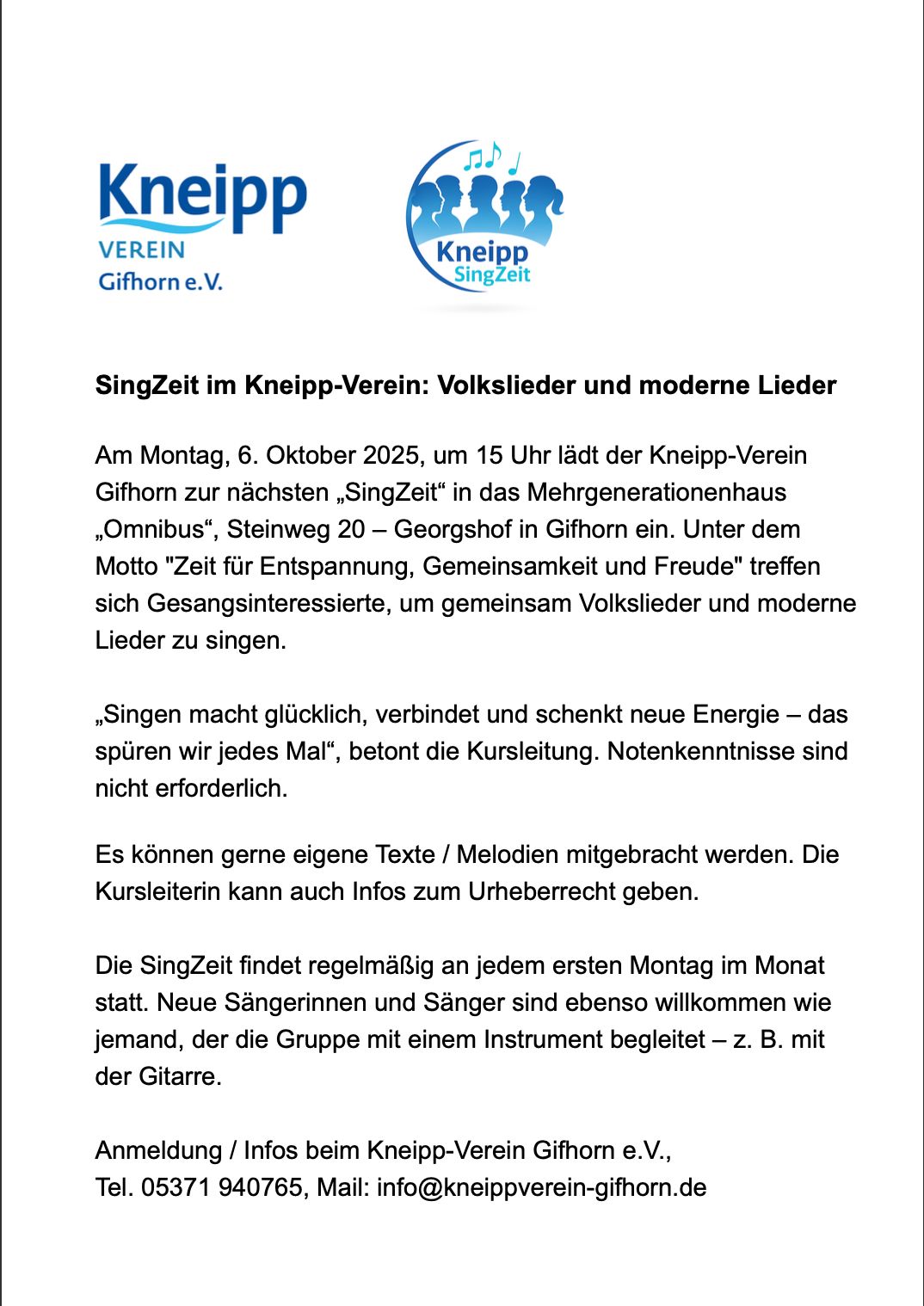 Jeden ersten Montag im Monat um 15 Uhr finden sich alle Interessierten im Mehrgenerationenhaus Omnibus in Gifhorn (Georgshof, Steinweg 20) zum gemeinsamen Singen ein.